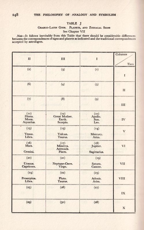 The Philosophy of Analogy and Symbolism [With a Chapter on Mystical Philosophy and The Fundamental Processes as Illustrated by the Graeco-Latin Gods and the Solar System (see image of Table)].