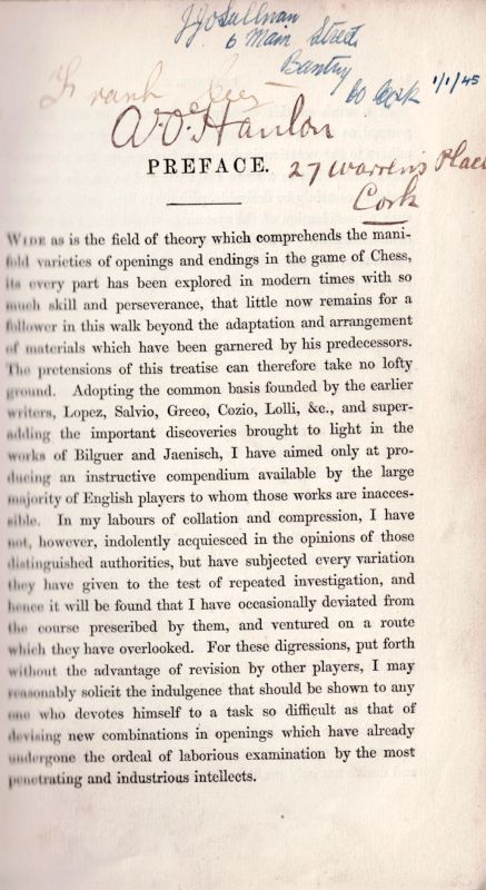Second Edition, revised. London, Henry G.Bohn, 1848. Octavo. Coloured Frontispiece showing a Chessboard (″The Spynx”) with the position of “White Playing First Mates in Eleven Moves”, VIII, 518 pages. Original publisher’s binding. Red cloth with gilt-embossed chess board on front cover. Very good condition with only minor signs of wear. Very interesting names of 19th and 20th century irish preowners written inside the book: J.J.O’Sullivan in Bantry / W. O’Hanlon (Cork) /