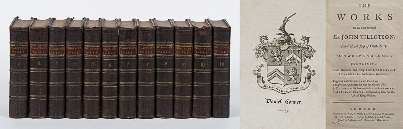 Twelve Volumes (complete set). London, Printed for R.Ware, A.Ward, J. and P. Knapton, T.Longman, R.Hett, C.Hitch, J.Hodges, S.Austen, J. and R. Tonson, J. and H. Pemberton, and J.Rivington, 1743. Octavo. Including the rare and often missing Frontispiece-Portrait of “His Grace John Lord Arch Bishop of Canterbury (by Kneller and Gerard van der Gucht). Original Hardcover (full leather with original spine-labels and gilt ornament. Very good condition with only minor signs of wear, some faded signs of a dampstain to endpapers and very few tiny wormhole-damages to margins of very few Volumes. The very rare 12-Volume set (not the more common 10 Volumes). A rare set in this excellent condition. From the library of Daniel Conner (Connerville / Manch House), with his Exlibris / Bookplate to pastedown.