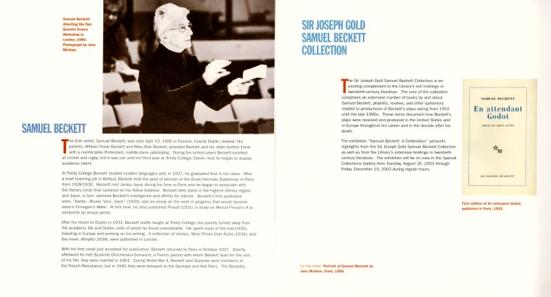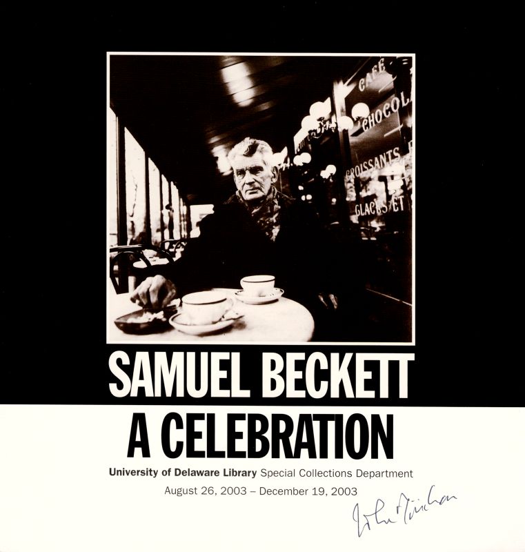“Samuel Beckett – A Celebration” – Wonderful piece of Ephemera / Printed Program for the Special Collections Department of the university of Delaware, using photographs of John Minihan to exhibit and celebrate first editions of Beckett’s “Waiting for Godot” etc. [Signed by John Minihan].