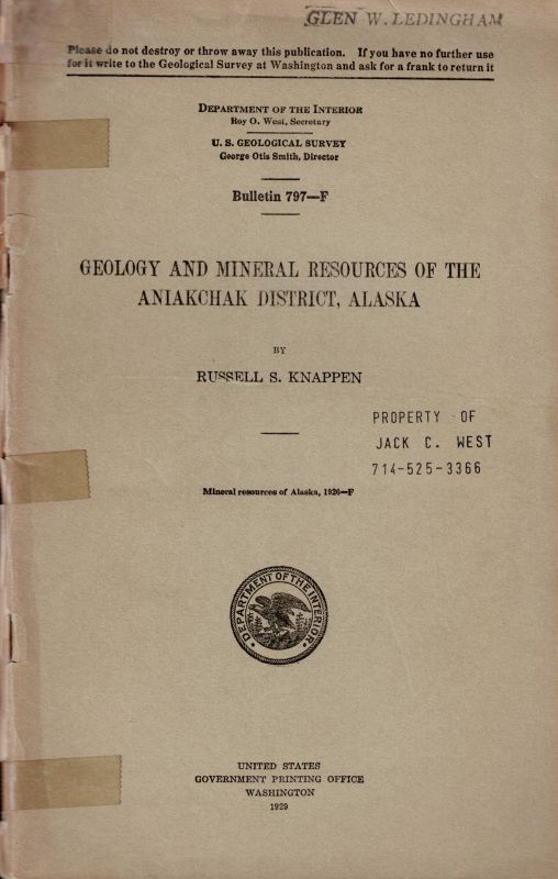 Geology and Mineral Resources of the Aniakchak District, Alaska. [Provenance: This rare Pamphlet with a large Folding Map of the Aniakchak District, was given to W.D.Gill by american geologist Glen W. Ledingham (Gulf Oil)].