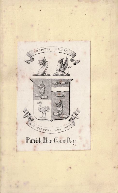Second Edition. London, Smith, Elder and Co., 1868. Octavo. 309 pages plus six unnumbered pages of a Catalogue of publisher Smith, Elder and Co. Hardcover / Original publisher’s cloth with gilt lettering on spine and front board. Poor condition with stronger signs of wear. The binding is fragile with the bookblock slightly separating from the binding. Still, the overall condition is still Good+ with foxing throughout (as usual with this publication) and a faded dampstain to rear endpaper and pastedown. From the library of Patrick MacCabe Fay, with his Bookplate / Exlibris to front free endpaper with the Family-Motto: “Toujours Fidele – Aut Vincere Aut Mori” [″Always Faithful – Either Win or Die”](see image). Very Rare publication !