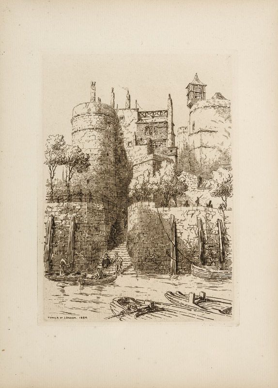 Original Etching. London, The Fine Art Society, 1884. 26 cm x 37 cm. Original, vintage etching by Sir Ernest George. Signed in the plate, not in pencil ! Only very faint signs of some foxing. Mounted, ready to be framed. With descriptive Letterpress by Ernest George (included is a wonderful historic explanation regarding this old location in London by Ernest George).