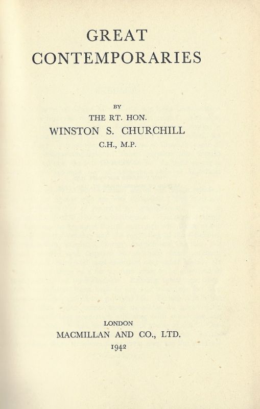 Famous publication with biographical essays by Churchill on The Earl of Rosebery / The Ex-Kaiser / George Bernard Shaw / Joseph Chamberlain / Sir John French / John Morley / Hindenburg / Herbert Henry Asquith / Lawrence of Arabia / F.E. First Earl of Birkenhead / Marshal Foch / Alfonso XIII / Douglas Haig / Arthur James Balfour / Hitler and his Choice [in] 1935 / George Nathaniel Curzon / Philip Snowden / Clemenceau / King George V / Lord Fisher and his Biographer / Charles Stewart Parnell / B.-P.