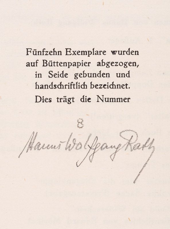 Frankfurt am Main, Verlag Carl Fr. Schulz, 1916. Oktav. Frontispiz mit einem photographischen Portrait von Rath [Lichtbildaufnahme von Hugo Erfurth=Dresden], 36 nn. Seiten. Stoffeinband. Limitierte Auflage: Fünfzehn Exemplare wurden auf Büttenpapier abgezogen und handschriftlich bezeichnet. Die trägt die Nummer 8. Von nur fünfzehn Exemplaren ! Voll signiert von Hanns Wolfgang Rath. Gedruckt im Sommer 1916. Aussergewöhnlich gut erhalten. Von grosser Seltenheit.