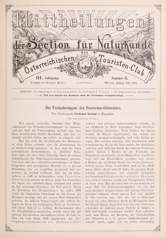 Includes, for example, the following: Günther Ritter Beck v. Mannagetta, ‘Alpenpflanzen an Thalstandorten und die Wichtigkeit ihrer Beobachtung’ (Vol.I, No.1) / B. Schwalbe, ‘Ueber einige Höhlen am Südharz’ (Vol.I, No.5) / Moritz Hoernes, ‘Die sogenannten “Passfunde” in den Alpenländern’ (Vol.I, No.5) / Franz Kraus ‘Ueber die hydrologischen Verhältnisse der Thäler von Reifnitz und Gottschee’ (Vol.I, No.6) / R. Daublebsky Ritter von Sterneck, ‘Ueber die Eislöcher von Eppan in Tirol’ (Vol.I, No.6) Ferdinand Seeland, ‘Neue Gletscherschliffe auf dem Thomasberge bei St. Margarethen im Rosenthale’ (Vol.I, No.8) / E. Hackel, ‘Die Gräser in den Alpen’ (Vol.I, No.12) / Robert Sieger, ‘Gletscher -und Klima-Schwankungen’ (Vol.II, No.2) / Rudolf Raimann, ‘Das Wiedererwachen der Vegetation’ (Vol.II, No.3) / Günther Ritter Beck v. Mannagetta, ‘Ueber das Vordringen östlicher Steppenpflanzen in Oesterreich’ (Vol.II, No.5) / Carl Schwippel, L. Ganglbauer und E. Kittl, ‘Die niedere Thierwelt unserer Grotten’ (Vol.II, No.8) / Josef Damian ‘Der Alleghe-See’ (Vol.III, No.1) / R. Trampler, ‘Die Grotte von Schoschuwka in der “Mährischen Schweiz”’ (Vol.III, No.4) / Ferdinand Seeland, ‘Die Veränderungen des Pasterzen-Gletschers’ (Vo.III, No.6) / Ernest Kittl, ‘Die Säugethierfauna Mitteleuropas und ihre Wandlungen’ (Vol.III, No.12) / E. Hackel, ‘Das Verhalten der Alpenpflanzen bei der Cultur im Tieflande’ (Vol.IV, No.4) / Gottlieb Marktanner-Turneretscher, ‘Ueber die Anwendung der Photographie in den beschreibenden Naturwissenschaften,’ (Vol.IV, No.5) Ornitho-faunistische Studien aus dem mähr.-schles. Gesenke’ (Vol.IV, No.11) / Ernst Kittl, ‘Ueber die Verbindung geologischer Studien mit Alpentouren’ (Vol.IV, No.12) K. Schwippel, ‘Die Ablagerungen der Tiefsee’ (Vol.V, No.2) / K. Schwippel, ‘Die Mörtelbiene (Chalicodoma muraria L.) und ihr Nest’ (Vol. V No.9) / Heinrich Glück, ‘Die Vogelwelt des Praters’ (Vol.VI, No.1) / Adolf Steuer ‘Formol als Conservierungsflüssigkeit’ (Vol.VII, No.2) / Dr. Carl Schwippel, ‘Die Torfmoore in Osterreich-Ungarn’ (Vol.VII, No.5) / Ernst Kittl, ‘Dolomit’ (Vol.VII, No.11) / Dr. A. König, ‘Schlafendes Leben im Pflanzen- und Thierreiche’ (Vol.VIII, No.2) etc.