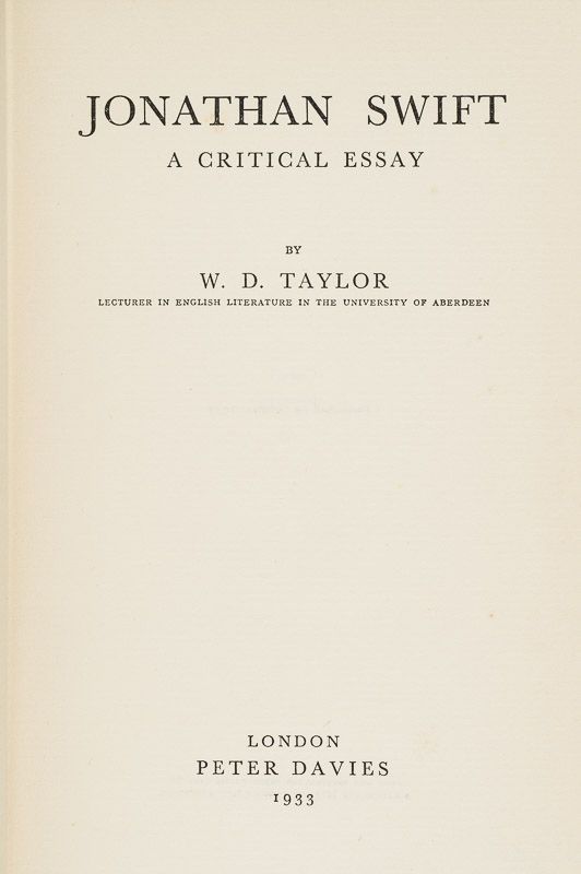 Includes, for example, the following: Early Life / The Battle of the Books / A Tale of a Tub / Ireland and England (1700-1710) / English Politics (1710-1714) / The Dean of St. Patrick’s / Intimate Life / Gulliver’s Travels / Poems / Swift’s Style / Closing Years / A List of the More Important Works Referred to / Index etc.