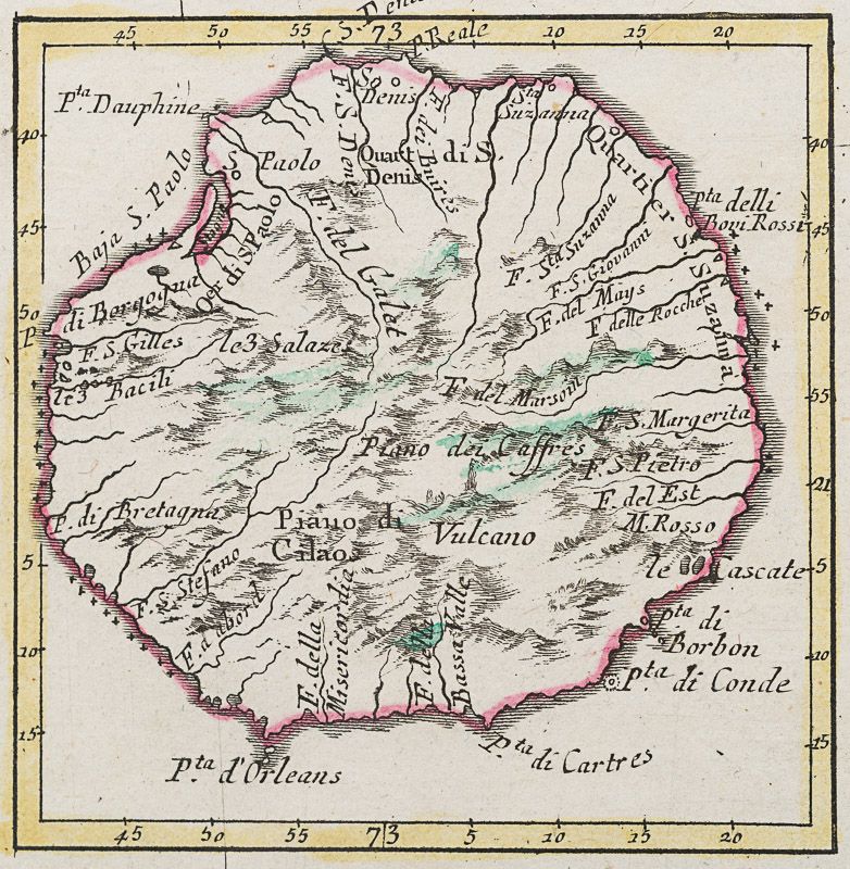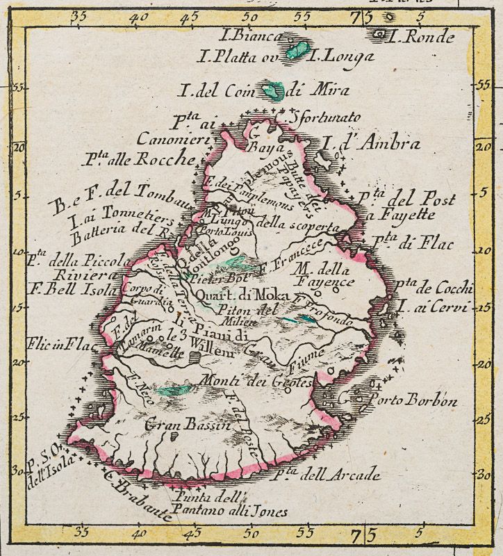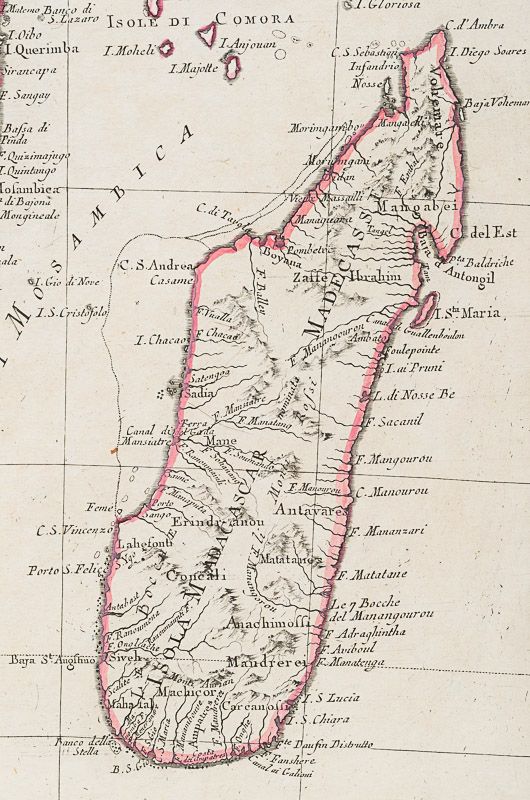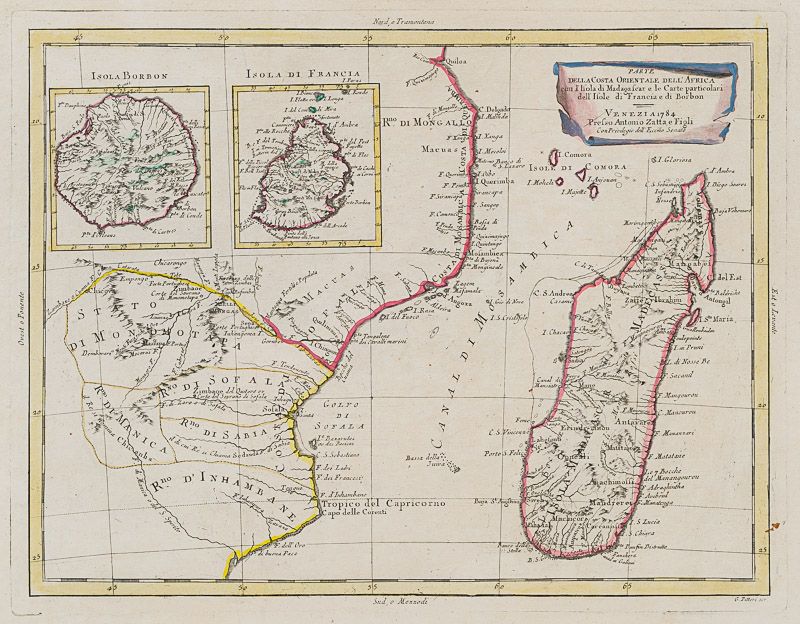 Hand-coloured border with latitudinal and longitudinal lines. Coloured interior map borders. Very interesting and decorative map of the east coast of Africa (in modern-ay Mozambique), which was then under Portuguese rule. Also included are two maps of Isola Borbon (Reunion Island) and Isola di France (Mauritius). The shows the administrative divisions, cities, towns, coastal towns, mountains and rivers. Smaller islands off the African coast, such as the French-controlled ‘Isole di Comora’ (Comoros). The Tropic of Capricorn runs across the lower section of the map.