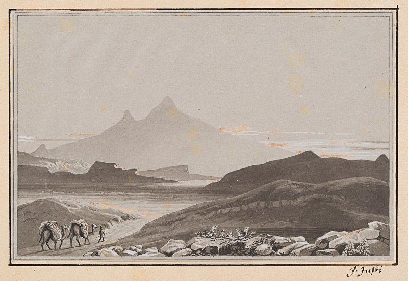 Beautiful painting North African landscape, featuring a traveller leading his two camels along a widening path as mountains loom in the distance.