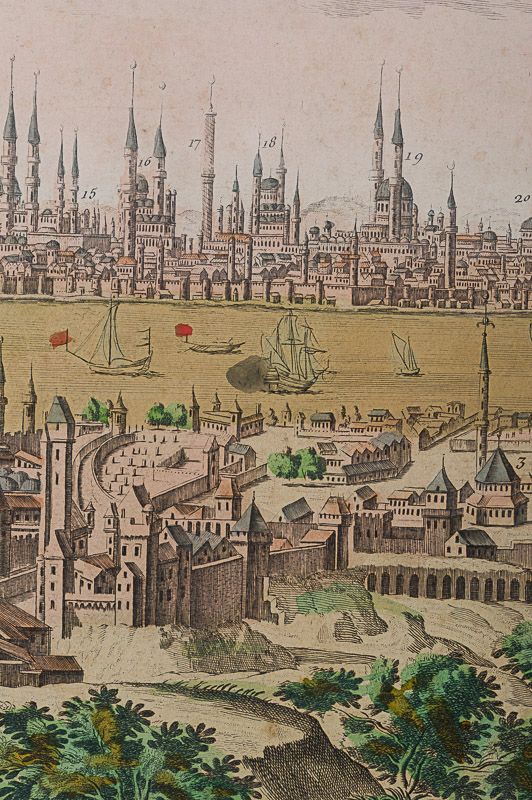 The delightfully water-coloured skyline is pierced by tall minarets of the city’s many mosques: the Hagia Sophia, Süleymaniye Mosque and the Sultan Ahmed (Blue) Mosque stand preeminent among these. The famous fortified walls of Constantinople can also be observed.