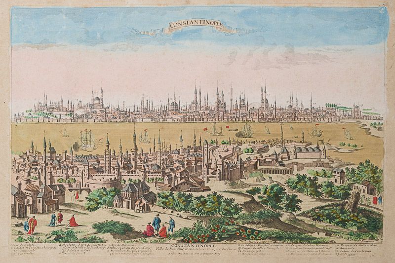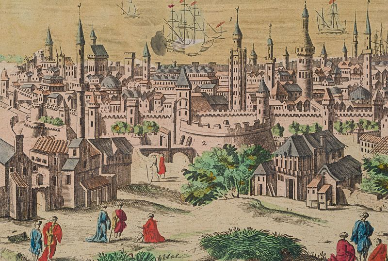 Townsfolk and passing ships illustrate that the capital city of the vast Ottoman Empire was the meeting place for people, ideas and trade throughout history.