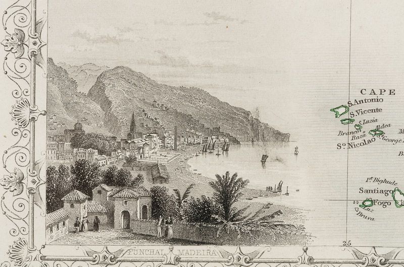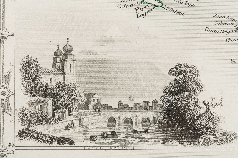 Islands in the Atlantic – Azores or Western Isles – Madeira [Inset] – Canary Islands – Cape de Verde Islands – Bermudas or Summer Islands. With Vignettes and illustrations of Faval, Azores, Chapel in the Rock, St Vincente, Tenerife, Canary Islands and Funchal, Madeira.