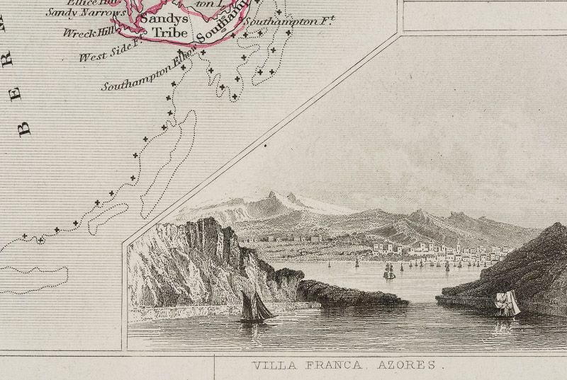 Beautiful map with gorgeous illustrated vignettes from the Victorian publisher. The coast of west Africa can be seen in the lower corner. Relief on Madeira shown with hachuring. Rivers and towns of Madeira also listed. The potentially dangerous waters off Bermuda are highlighted pictorially. The individual names of the Azores, Canary and Cape Verde islands can also be seen. A bar scale lies just under Bermuda.