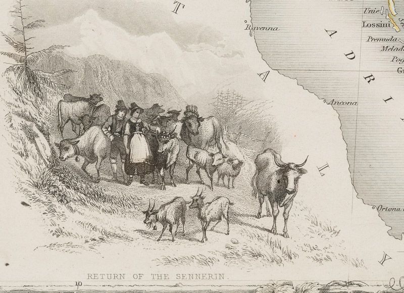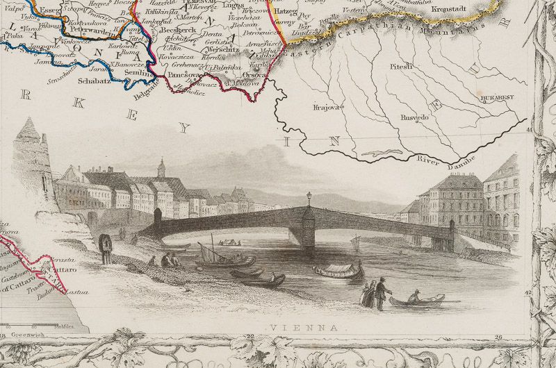 Beautiful map of Austria with gorgeous illustrated vignettes from the Victorian publisher. This is the Austria of the Hapsburgs and the political sub-divisions show the polyglot nature of this multi-national domain. Renowned cities such as Milan, Prague, Buda and Pest, and ancient regions such as Lombardy, Tyrol, Illyria, Carinthia, Salzburg, Istria, Bohemia, Moravia, Croatia, Dalmatia, Sclavonia, Hungary, Banat, Transylvania, Bukovina and Gallicia show the extent of Vienna’s empire. Prussia and Russia border her to the east after the three powers consumed Poland in the past century. Ottoman Turkey is still supreme in the Balkans for the time being. To the West lie Switzerland and the still-congealing Italian and German states. The Adriatic Sea washes Austria’s underbelly. A scale bar can be seen off the coast. The Hapsburg coat-of-arms is located in the top right corner of the map. Relief is shown through hachuring. The mighty Danube flows irresistibly and timelessly across a region that would be undergo radical reorganisation and bloodly tumult over the next century or more.