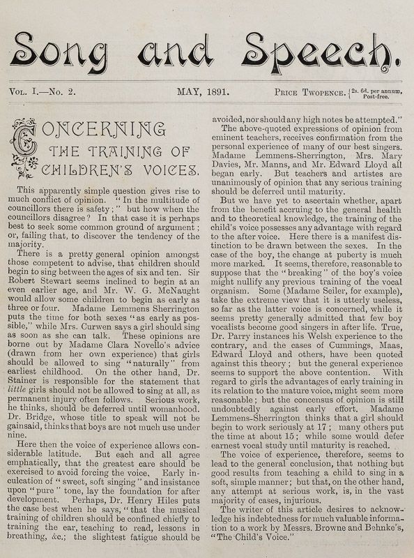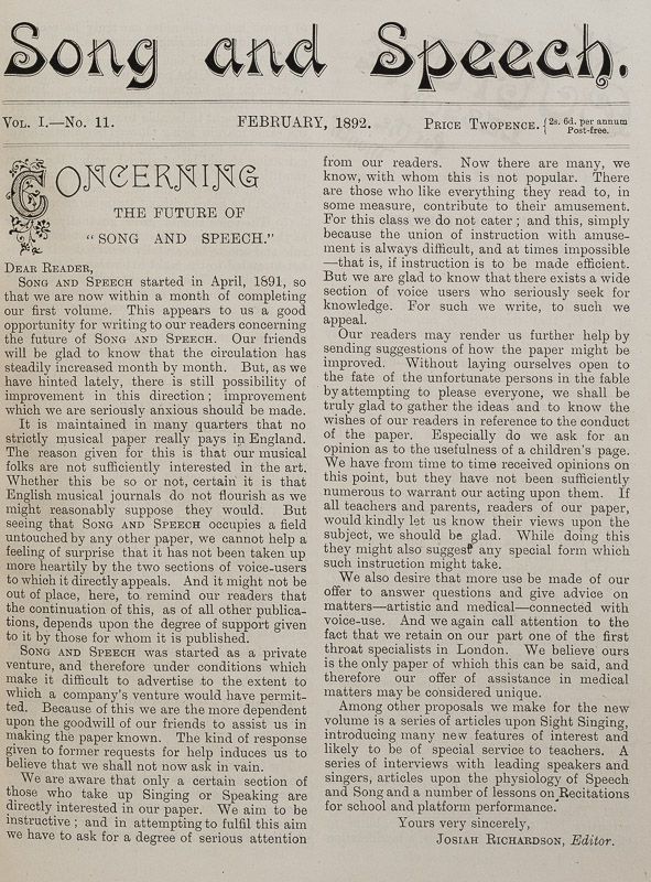 Josiah Richardson, the editor, was able to win over contributors from all fields of Song, Reciting and Speech-Therapy of the outgoing Victorian Era. Articles include: Howard Paul – “The Art of Making-Up” / E.Theodore Carrier – “Hymn Reading” / Concerning the Training of Children’s Voices / Louisa S. Sandy – “The Dress of Lady Performers” / Biographical Sketch of Alfred George Cargill Gentry” (with a photograph) / “The Tonic Sol-fa Jubilee Festival” / “The Philosophy of Expression” / Dr. Hans Richter – “Musical Conductors” / “Concerning the Simian Tongue” / J.Harry Wheeler (Boston) – “Hints for Voice Training” / Walter Wadham – “Songs worth singing and how to sing them by the River” / Interviews with Leading Singers and Speakers: “Mr.William Nicholl” (Interviewed by Edwin Oliver) / A.T.Goodrich – “Style and Construction of Vocal Solos – Humorous or Buffo Songs” / “Pianoforte Accompanying” / “Original Recitations – Written or Arranged Expressly for “Song and Speech”: “Betsy Prigg’s Visit to Mrs. Gamp” / etc. etc.