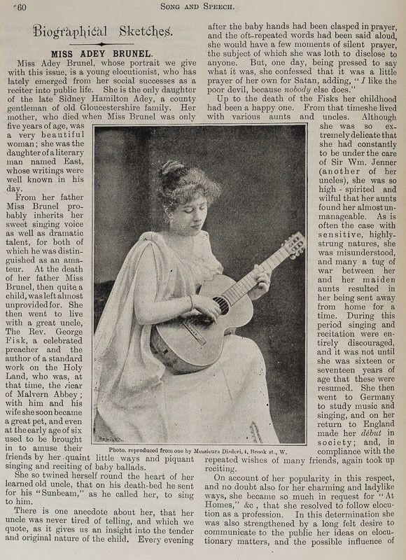 This short lived periodical is striking for its excellent, in-depth articles on topics like “Voice Culture” (Lesson for the Month: Tone Formation) / “Sight Singing and Notation” / “Vocal Physiology” / “Something for the Children” / “Songs Worth Singing and How To Sing Them” / “Advice to Singers” / “Articulation for Singers” / “Concerning Critics” / “Concerning The Future of Song and Speech” / “Interviews with Leading Singers and Speakers”″Lessons on Word Painting” / “British Dialects” (an article on the usefulness of knowing british dialects “to reciters and in a lesser degree to singers. In sustaining the various country characters so frequently introduced into plays and sketches) For example “Mid-Yorkshire Dialect”/ “Concerning Nervousness” / “Mark Anthony on the Death of Caesar – Shakespeare – A Study for Reciters” / Included are also Bookreviews on the topics of Song and Speech (For example “M.Bautain – Extempore Speaking” / Margaret H. Lawless – “Bring out your Dead” – A Study for Reciters / “Memorising” / “Celebrated Voices: Jenny Lind” / Biographical Sketch of “Miss Adey Brunel” (with a photograph of Adey Brunel playing the Guitar) / “Postures and Motions of the Hand” etc. etc.