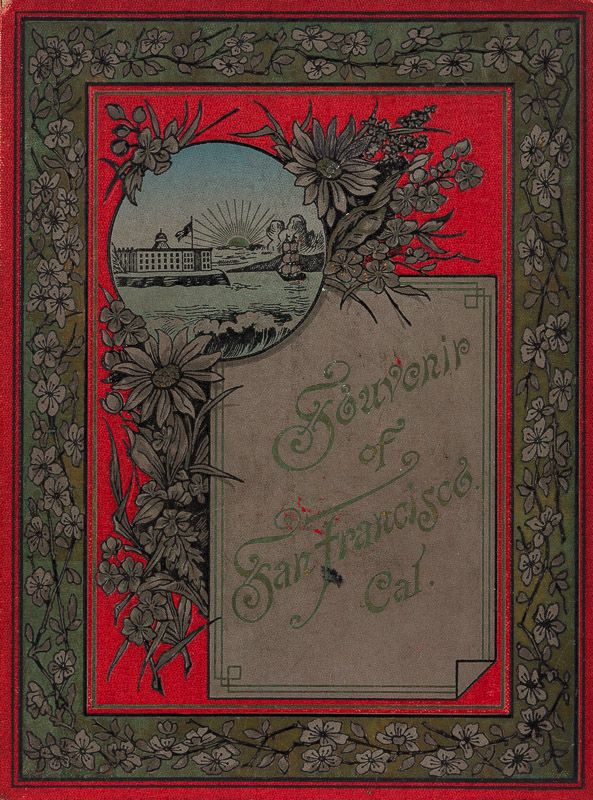 The later edition (ca.1894-1898), in decorative, red cloth, contains 24 pages of illustrated Leporello and 30 pages of the booklet. Illustrations include the Ferry Building, which was completed in 1898. (No clock face is described)