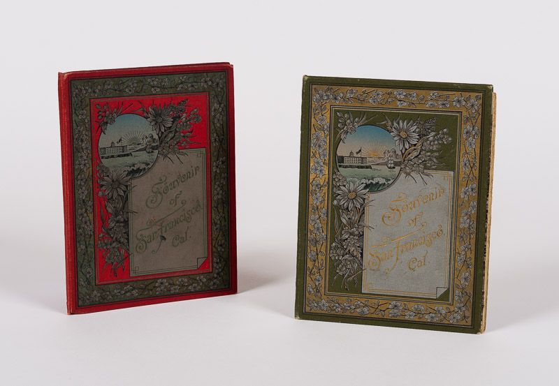 2 volumes ( 2 different editions of the same publications.) San Francisco, C.P. Heininger, 1889 / (ca.1898). 14.5 cm x 19 cm. 44 pages with illustrations (including bird’s eye view of San Francisco), 60-page-booklet with descriptions tipped into rear of the Leporello (the booklet cleanly detached but complete). Original, beautifully illustrated Hardcover Leporello / Accordion / Concertina – tourist publication with blindstamped emblemata “Eureka” to the rear board. Excellent condition with only minor signs of external wear for the later edition. The Leporellos both in unusually, excellent condition. No fraying to the folds of the Leporellos. Binding of the 1889 edition is poorer, The Leporello and the booklet of this version are completely detached. A few tears and damages between the folds. Both interior of booklets are very clean. Overall very good condition and all illustrations are superfresh! Extremely scarce.