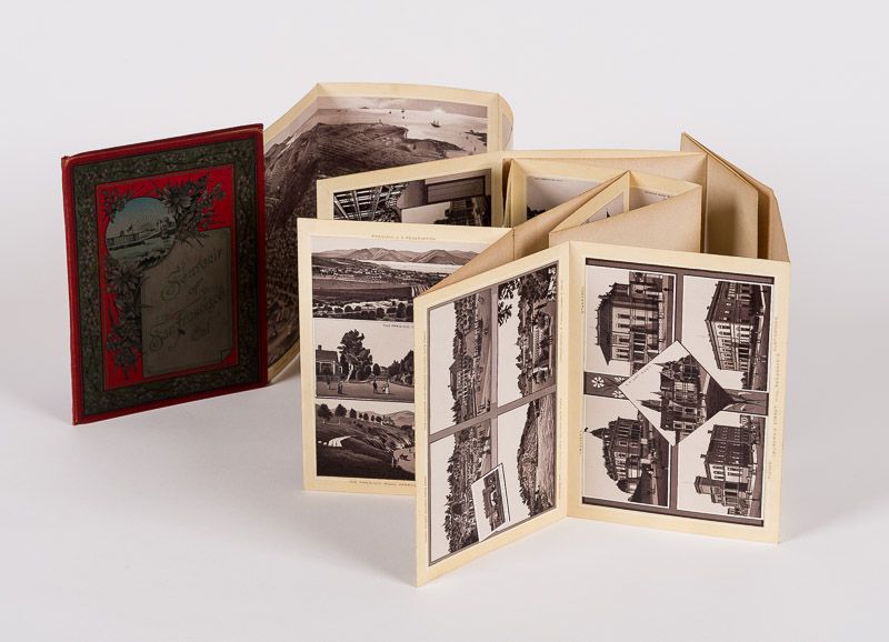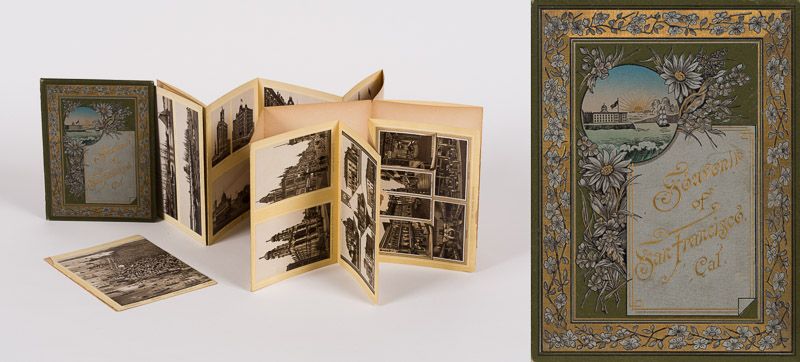 Historical Souvenir of San Francisco, California – with Views of Prominent Buildings, the Bay Islands, Stock Exchange etc. [Two Binding – Variations of the Fantastic original Tourist – Panorama of San Francisco / 12 years before the earthquake destroyed most of the buildings displayed in this Leporello / The Souvenir shows also a remarkable Birds Eye View of San Francisco ].