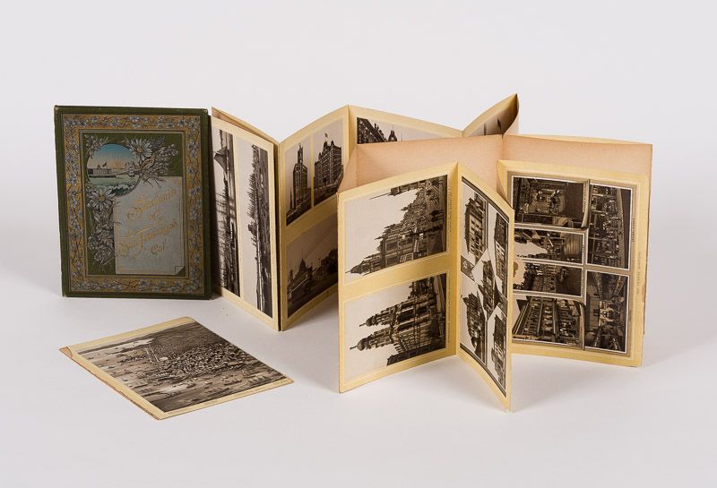 The 1889 edition, in decorative, green cloth, contains 20 pages of illustrated Leporello and 30 pages of the booklet. Illustrations include the old Rail Road Ferry Buildings before the construction of the clock tower.