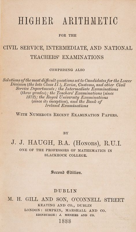 Higher Arithmetic for the Civil Service, Intermediate, and National Teachers’ Examinations. Comprising also Solutions of the most difficult questions set to Canditates for the Lower Division (the late Class II), Excise, Customs and other Civil Service Departments; the Intermidiate Examinations (three grades); the Teachers’ Examinations (since 1872); the Royal University Examinations (since its inception), and the Bank of Ireland Examinations with Numerous Recent Examination Papers.