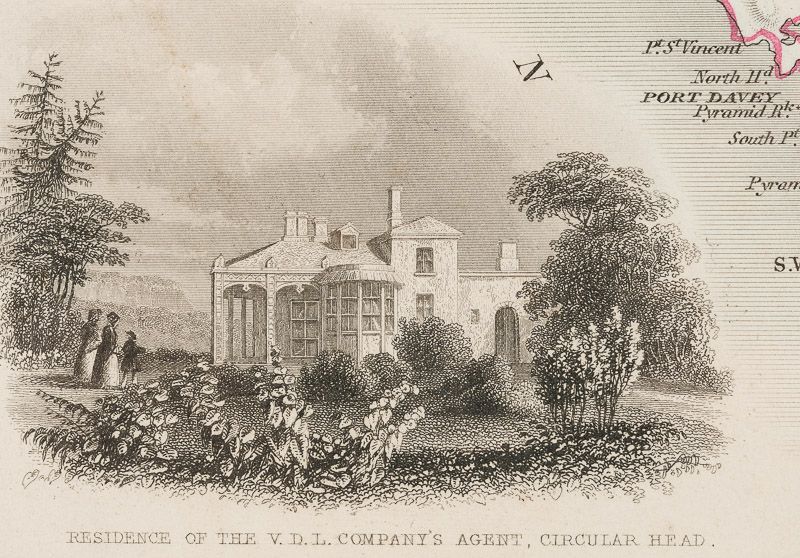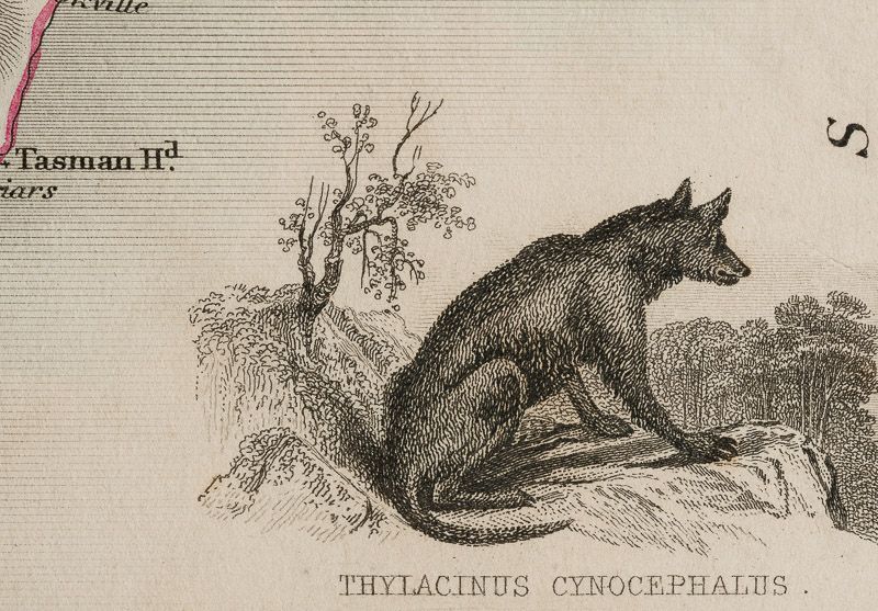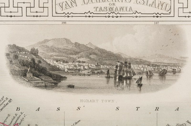Van Diemen’s Land or Tasmania with beautiful Vignettes and illustrations of Hobart Town, Residence of the Company’s Agent, Circular Head / Thylacinus Cynocephalus. The map shows the old districts of Tasmania: Dorset, Cornwall, Glamorgan, Pembroke, Cumberland, Buckingham, Kent, Devon, Westmorland etc.