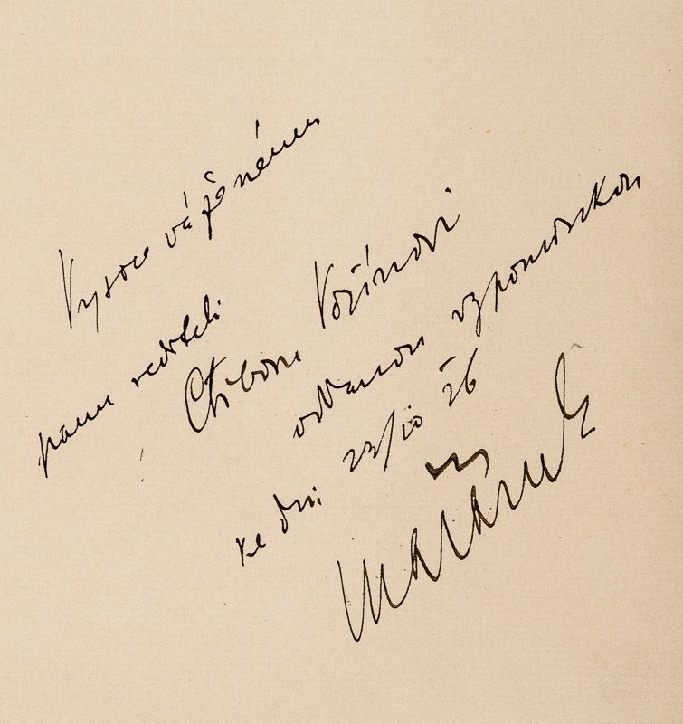 (Praha), Edice Olymp, [1926]. Large Octavo. 44 pages. First edition in publisher’s printed wrappers – Typography of the wrappers by Vit Obrtel. A very good, uncut copy, some edge wear and minor browning. One of only 500 copies (this one unnumbered). Signed and inscribed by Jiri Maránek in the year of publication. [Edice Olymp – Svazek 4].