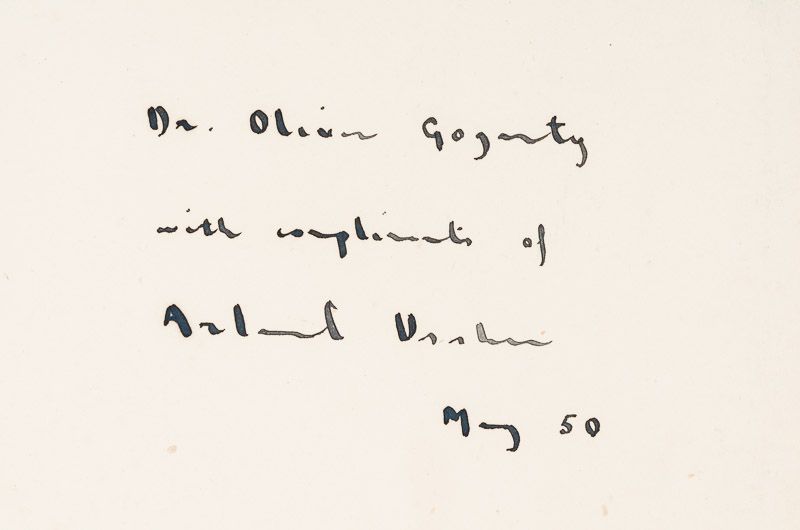 Third Impression. London, Victor Gollancz Ltd., 1950. 15 cm x 21.5 cm. 142 pages. Modern Hardcover binding (grey cloth with black lettering on spine andnew endpapers). Excellent condition. This book comes from the library of Oliver Joseph St. John Gogarty and was signed and inscribed to him by Arland Ussher on the halftitle in May 1950. A very nice association copy.