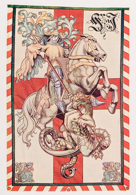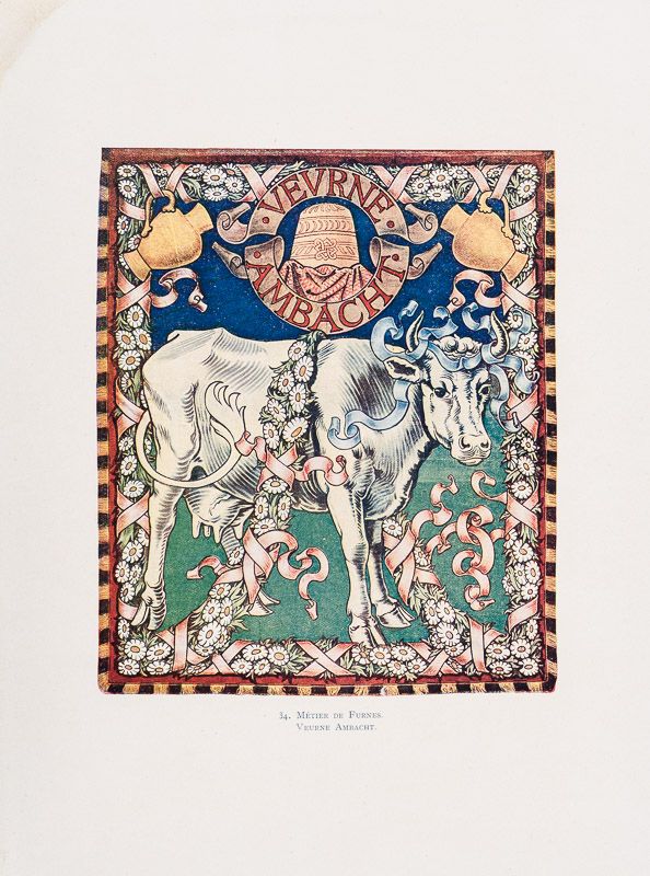 Bruxelles, Des Presses de la Soc. An. Belge D’Imprimerie, 1913. Folio. 12 Pages de texte, 40 Planches hors texte en couleurs (12 pages text and 40 plates with tipped in colour – plates of Tapestries, Souvenir – Wimpel etc.). Hardcover / Privately professionally bound. Frontcover of the original dustjacket pasted on the halftitle. Excellent condition with only minor signs of external wear and some mild dampstain to very few pieces of teh artwork and the outer margins of the endpapers and first pages of text only.
