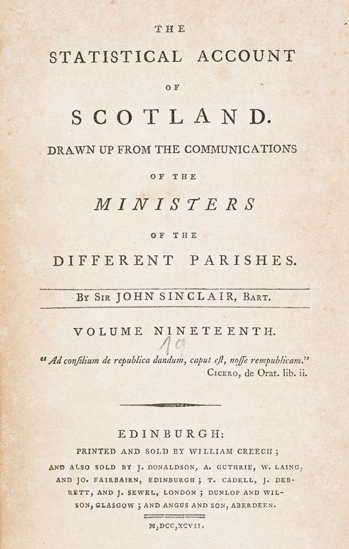Volume 19 includes for example: Halkirk/ Falkirk/ Roxburgh/ Aberdeen/ Alnefs/ Stornoway/ Barvas/ Lochs/ Uig/ Rhynie and Effie/ Aboyne and Glentanar/ Boyndie/ South Knapdale/ Kinclaven/ Bendothy/ Tannadice/ Rothiemay/ Orphir/ Kilmany/ Dunning/ Tundergarth/ Annan/ Tarbolton/ Longforgan/ Madderty/ Minto/ Collington/ Innerleithen/ Glenbucket/ Yetholm/ Auldearn/ Killean and Kilchenzie etc.