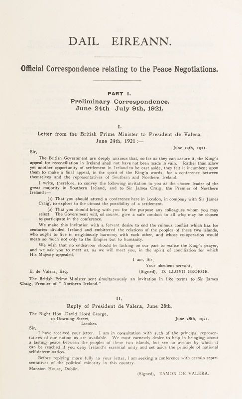 Official Correspondence relating to the Peace Negotiations (June – September, 1921). Part I – Preliminary Correspondence / Part II – Correspondence arising from the Conversations at London, between President de Valera and the British Prime Minister.