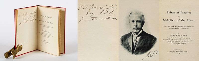 Points of practice in Maladies of the Heart – [INSCRIBED / SIGNED – with a signed (monogrammed) portrait-postcard of Sir James Sawyer] – Lumleian lectures at the Royal College of Physicians of London.