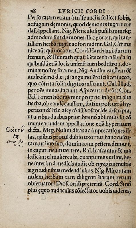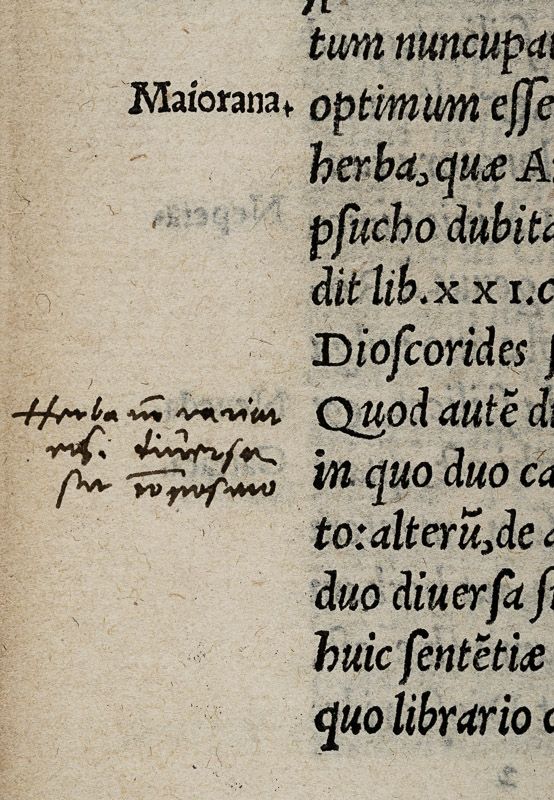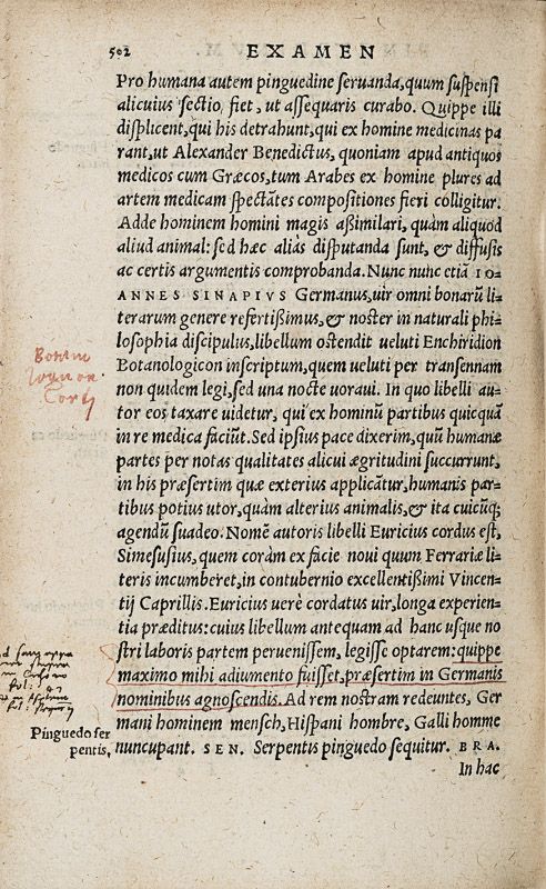 Manuscript annotations throughout the Botanologicon reference the genus Cuscuta in Brasavola’s Examen. This is an important discovery because it supports Hieronymus Schreiber’s ownership / Schreiber suffered knowingly from chronic liver-problems and famously, prior to the fateful trip to Italy with Valerius Cordus, he went to Aachen to cure and seek relief from this very issue. Cuscuta was not only in TCM, but also generally, known during the Renaissance as remedy for liver-issues.