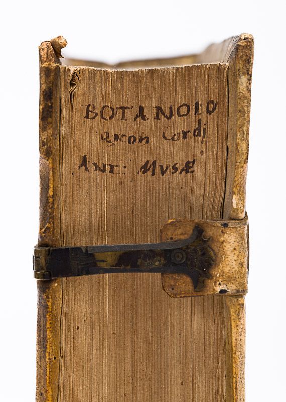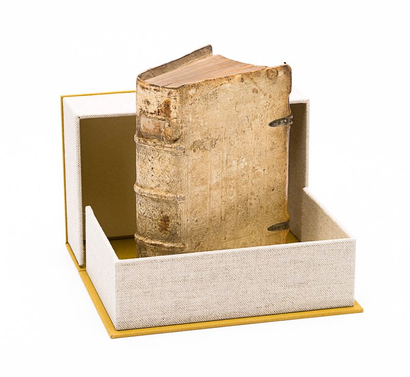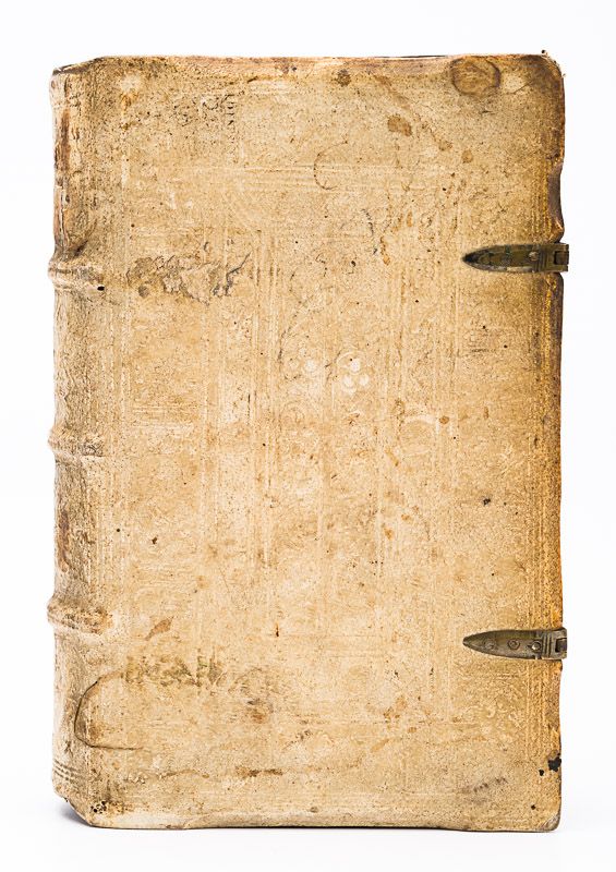 Cologne (Köln) / Leyden (Lyon), Johann Gymnicus (Gymnich) / Johannes and Franciscus Frellon, 1534 / 1537. Octavo. Collation complete: I. Euricius Cordus – Botanologicon: Title with the woodcut device of Cologne-printer Johann Gymnicus, including his Motto, the first line of a Verse from the Aeneid by Virgil ‘Discite Iustitiam Moniti’, 183, [21] pp., 2 blank leaves. The titlepage of the Botanologicon bears the manuscript ownership-entry of Nuremberg’s Astronomer, Philosopher and Mathematician Hieronymus Schreiber [also called Jerôme Schreiber], student-friend of Euricius Cordus’ son Valerius Cordus in Wittenberg and later trustee of Valerius Cordus’ scholarly estate after Valerius Cordus’ premature death in Rome. Dated in the same hand on the titlepage also the entry ‘Anno 1539’, when Valerius Cordus matriculated at Wittenberg and Schreiber already had studied there since May 1532. With several contemporary manuscript annotations throughout both titles (the Botanologicon and Examen) / II. A. M. Brasavola – Examen omnium simplicium medicamentorum: Title, [1], [‘Reverendissimo to Ioannes Argenterius’, 4 pp.], [‘Ad Illustris & Sereniss. (‘Epistola Nuncupatoria’) to the Duces of Ferrara’ 17 pp.], [Epigramma, 1 p.], [Examen & Aristotelis Problemata 542 pages, [Dedication to Franciscus Frellaeus, 2 pp.], [Index copiosissimus in Examen Omnium, 13 pp.], [1]. With several manuscript annotations. Original, contemporary blind-stamped pigskin over wooden boards with some stronger signs of running to the corners, with partially bevelled edges and both of the original metal clasps intact. Very good condition with only minor signs of external wear. Title in ink to upper spine and also to top of fore-edge. Very few pressed plants loosely inserted. Interior in excellent condition with some minor staining to very few pages only.