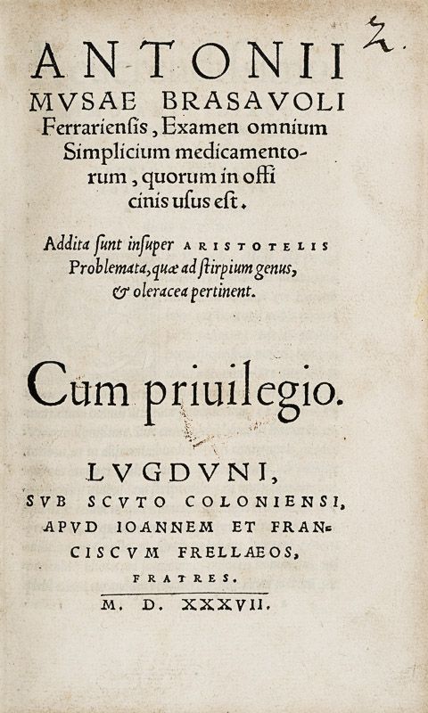 Botanologicon (Euricii Cordi Simesusii Medici Botanologicon) – Angebunden / Bound with: Antonio Musa Brasavola – Examen omnium simplicium medicamentorum, quorum in officinis usus est. Addita sunt Insuper Aristotelis problemata, quae ad stirpium genus, & oleracea pertinent.