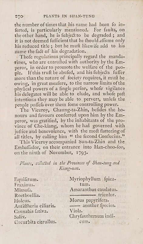 This fantastic and detailed description of the late 18th century-expedition to China, recorded by irish botanist, Sir George Leonard Staunton, from Galway, also includes for example: A list of Plants collected in the Journey between Peking and Zhe-hol in Tartary / List of Plants collected in the Provinces of Shan-tung and Kiang-nan / Bamboo plants described / Mulberry Trees and their culture / Nankeen cotton and their natural colour / Tallow trees / Of Ranks and Families in China / Intelligence of Sir Erasmus Gower / Culture of Rice / Chinese method of raising crops of vegetables upon the water and on marshy grounds / General descriptions of Chinese towns / Principal mode of travelling in China / Surgical operations less dangerous in China than in the north of Europe / etc. etc.