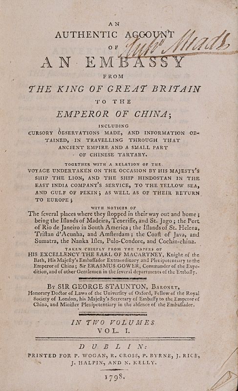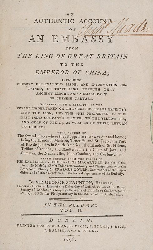 An Authentic Account of an Embassy from the King of Great Britain to the Emperor of China [First Dublin Edition with 34 full-page-plates]; Including Cursory Observations Made, and Information Obtained, in Travelling Through That Ancient Empire, and a Small Part of Chinese Tartary. Together with a Relation of the Voyage undertaken on the Occasion by his Majesty’s Ship ‘The Lion’, and the Ship ‘Hindestan’ in the East India Company’s Service, to the Yellow Sea, and Gulf of Pekin [sic]; as well as of their return to Europe. With Notices of the several places where they stopped in their way out and home: being the Islands of Madeira, Teneriffe and St.Jago, the Port of Rio de Janeiro in South America; the Islands of St.Helena, Tristan da Cunha and Amsterdam, the Coast of Java and Sumatra, the Nanka Isles, Pulo-Condore and Cochin-China. Taken chiefly from the Papers of his Excellency, the Earl of Macartney, Knight of the Bath, his Majesty’s Embassador Extraordinary and Plenipotentiary to the Emperor of China; Sir Erasmus Gower, Commander of the Expedition and other Gentlemen in the several Departments of the Embassy.