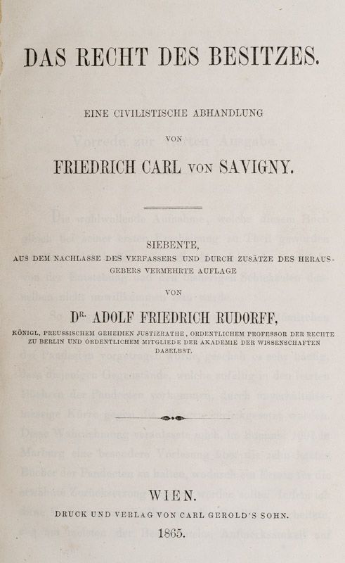 Wien, Druck und Verlag von Carl Gerold’s Sohn, 1865. Oktav. VIII, 765 Seiten. Hardcover / Originales Halbleder der Zeit. Bindung etwas fragil und am Ruecken angebrochen. Exemplar des bedeutenden schwedischen Juristen und Rechtsphilosophen Karl Olivecrona, mit seinem Namenszug auf dem Innendeckel / Very rare, definitive edition of Savigny’s work from the library of the important swedish lawyer and legal philosopher Karl Olivecrona (his name on pastedown).