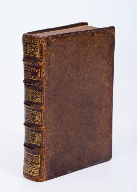Paris, Chez Mathurin Henault, Nicolas de la Vigne et Nicolas de la Coste, 1631. 12 cm x 16.5 cm. Frontispice, (6), 569 pages including a further 3 engravings (4 engravings including Frontispice). / Edition Originale, illustrée d’un frontispice gravé représentant la mort couronnée plus 3 gravures à représentations des Vanitez du Monde. Original Hardcover / Reliure d’époque de veau moucheté, dos à nerfs, caissons ornés, pièce de titre de maroquin marron, tranches rouges. Bon etat. Très rare ! / Minor repairs (professional) to the titlepage and only very minor lesion to some of the illustrations and some pages.