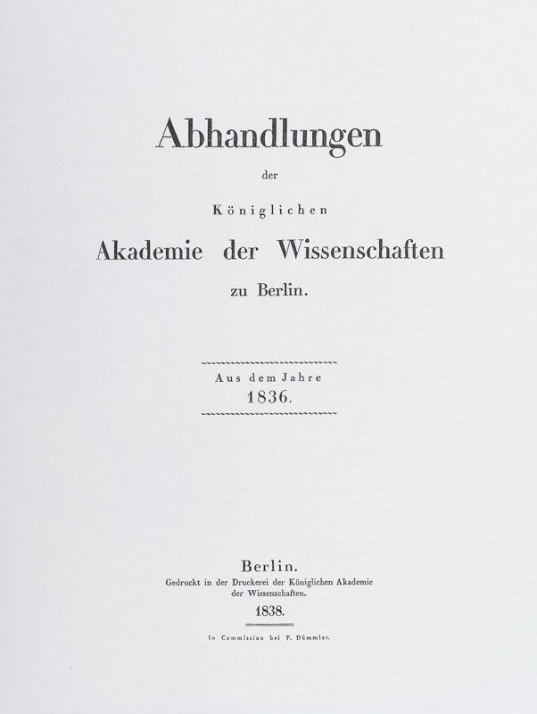Erste Ausgabe. Berlin, Druckerei der Königlichen Akademie der Wissenschaften zu Berlin, 1836-1838. Quarto (23.2 cm x 28.5 cm). 18 Seiten (Seiten 99 – 116 des Jahrgangsbandes 1836). Moderne Broschur mit eingebundener Originalabhandlung. Sehr guter Zustand. Es handelt sich hier um die seltene, originale Erstausgabe der Publikation. Extrahiert aus dem Sammelband der Abhandlungen der Königlichen Akademie der Wissenschaften zu Berlin. Der originalen Publikation wurde eine Replika des Reihentitels vorgebunden. [Abhandlungen der Königlichen Akademie der Wissenschaften zu Berlin. Aus dem Jahre 1836].