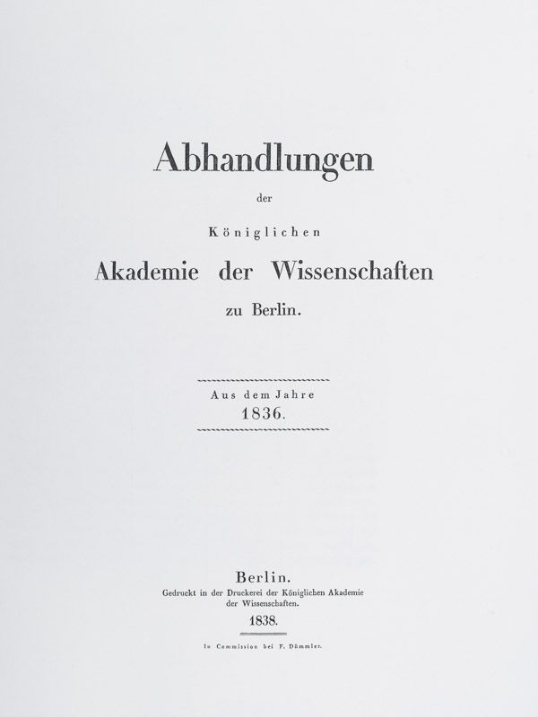 Erste Ausgabe. Berlin, Druckerei der Königlichen Akademie der Wissenschaften zu Berlin, 1836-1838. Quarto (23.2 cm x 28.5 cm). 21 Seiten (Seiten 205 – 225 des Jahrgangsbandes 1836). Moderne Broschur mit eingebundener Originalabhandlung. Sehr guter Zustand. Es handelt sich hier um die seltene, originale Erstausgabe der Publikation. Extrahiert aus dem Sammelband der Abhandlungen der Königlichen Akademie der Wissenschaften zu Berlin. Der originalen Publikation wurde eine Replika des Reihentitels vorgebunden. [Abhandlungen der Königlichen Akademie der Wissenschaften zu Berlin. Aus dem Jahre 1836].