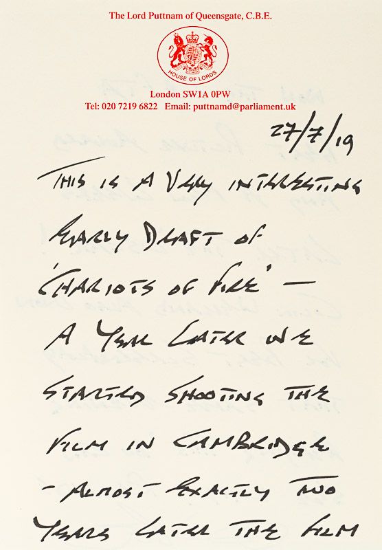 A xeroxed copy of the second draft of “Chariots of Fire”, which David Puttnam signed in 2019 and to which he added a wonderful manuscript note: “This is a very interesting early Draft of ‘Chariots of Fire’ – A year later we started shooting the film in Cambridge – Almost exactly two years later the film won the BAFTA Best Picture Award and a few weeks later The ‘Oscar’ ! – Colin Welland also won for Best Screenplay that same evening. Reading this you can see why. Regards – David Puttnam”.
