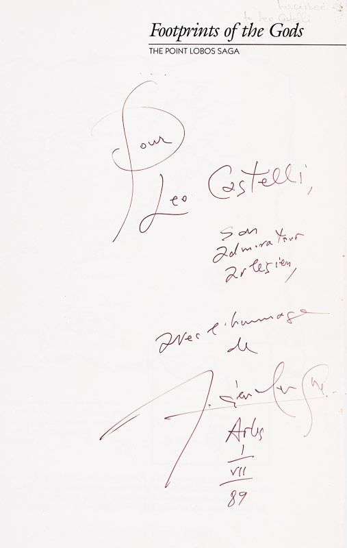 ″To the memory of Robert Louis Stevenson who dreamed of Point Lobos as Treasure Island; To Edward Weston, who, while immortalizing Point Lobos, gave me the key of my life in photography; To Wynn Bullock, my guide through the rocks of Edward Weston; To Virginia and Ansel Adams, godmother and godfather of my Point Lobos adventure; and To the students of my workshops, who have always encouraged me to keep on going – Lucien Clergue″