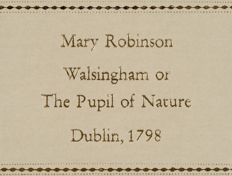 Mary Robinson’s fifth novel, “Walsingham; or, The Pupil of Nature”, was [First] published by T.N. Longman in 1797. Like her other novels, Walsingham addresses many political themes, such as women’s rights to inheritance, the value of personal merit over rank, and the importance of education for both sexes. In addition, Walsingham makes strong social critiques, particularly about socially-prescribed class and gender roles and about the dangers of excessive sensibility. The novel is also notable because of its generic mixing: poetry that is essential to the story’s development is interspersed throughout, and Robinson published these poems separately in newspaper poetry columns to popular and critical acclaim. (Source: LE – Literary Encyclopedia).