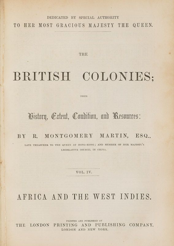 First Edition. London and New York, The London Printing and Publishing Company [that was J. and F. Tallis], no year (c. 1850). Quarto (20 cm x 27 cm). Volume I (British North America [Canada / USA]): Frontispice illustrated titlepage, XXIV, 360 pages with pages 1 – 9 missing / Volume II (Australia): pages 361 – 744 pages / Volume III (New Zealand / Tasmania): II, 384 pages. / Volume IV (Africa and the West Indies): II, 188 pages / Volume V (British India): II, 564 pages with pages 455 – 456 missing / Volume VI (Ceylon, East India and Mediterranean Settlements): II, 172 pages. Hardcover / Original, decorative publisher’s halfleather with gilt lettering and ornament to spines. Bindings rubbed but overall in firm and very good condition with only minor signs of wear. All maps and illustrations besides one illustration removed by a previous owner. In the course of removal of maps and illustrations, one page slightly torn and 11 pages of text missing. This is still one of the most important text-sources of British Colonial History, itsevaluation in Britain and a plethora of data on economical and political impact the Colonies had for the former Empire. No other contemporary 19th century publication includes details on colonial produce, movement of population and local History from Tasmania to Quebec, from Hong Kong to Heligoland (Helgoland), and in general on the depition of “England, the ‘Nursing Mother’ of Nations” (Introductory page XXIV by Montgomery Martin).