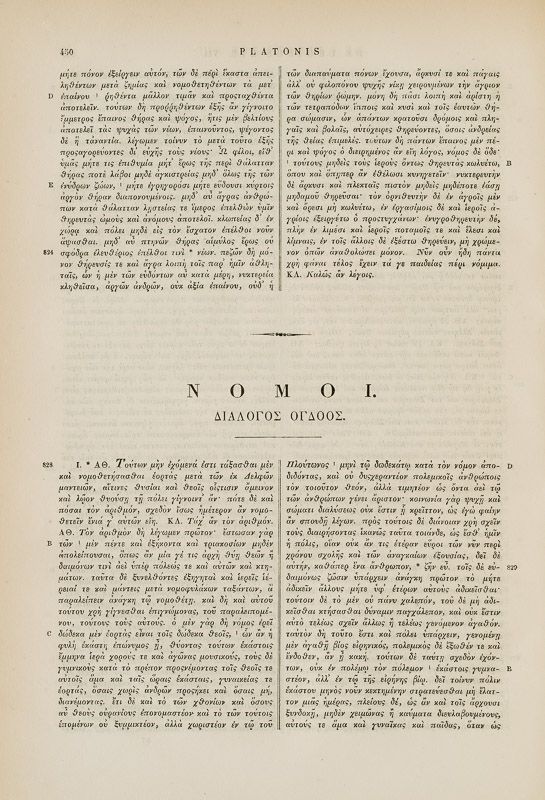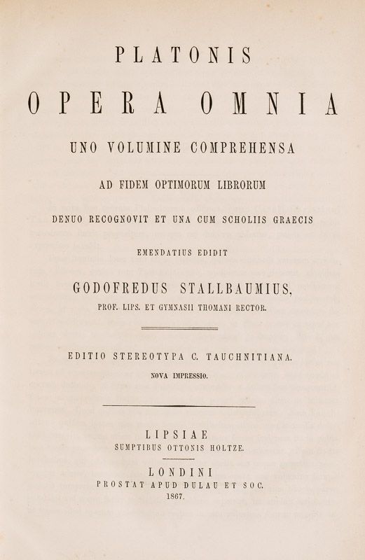 Platonis Opera Omnia. Uno volumine comprehensa ad fidem optimorum librorum denuo recognovit et una cum scholiis graecis. Emendatius edidit Godofredus Stallbaumius. [Original Greek Edition, printed in double columns – With Latin Index / Includes all X Books of “De Republica” and also the XII books of “De Legibus”].