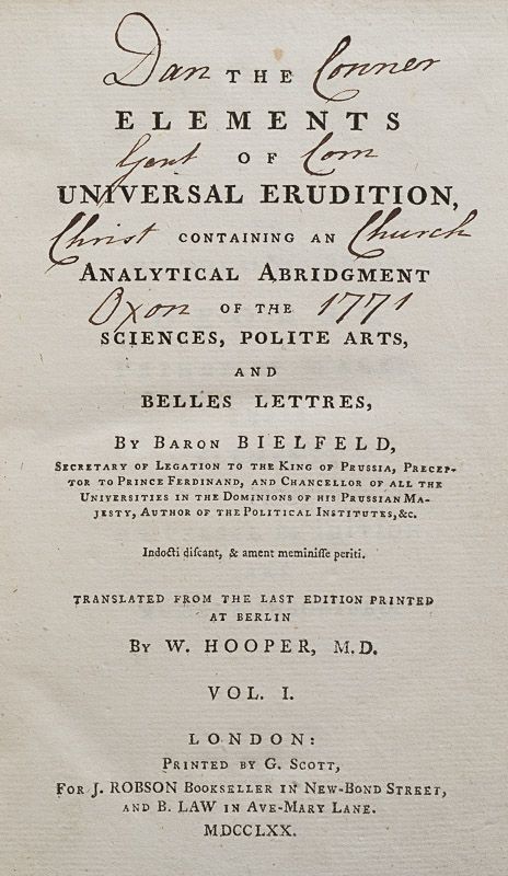 The Elements of Universal Erudition – Containing An Analytical Abridgment of the Sciences, Polite Arts, and Belles Lettres. Translated from the last Edition printed at Berlin by W[illiam] Hooper. [With the printed Dedication “To His Royal Highness, George, Prince of Wales”].