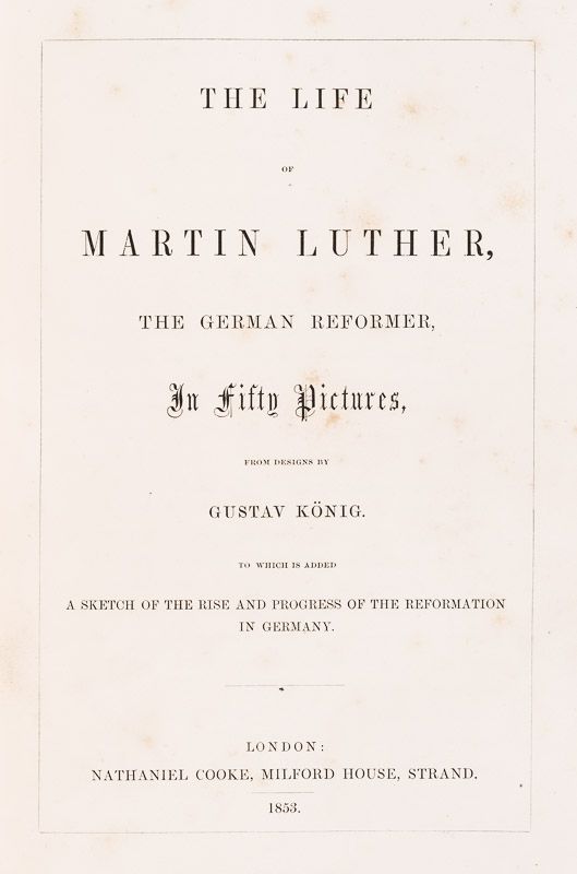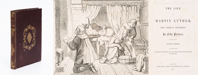 The Life of Martin Luther, The German Reformer – In fifty Pictures, from Designs by Gustav König to which is added “A Sketch of the Rise and Progress of the Reformation in Germany”. [Inscribed to “William R. F. Roberts from his affectionate Papa – Christmas 1860”].