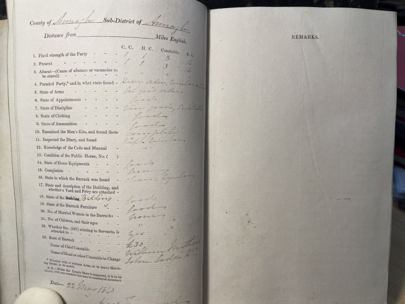 Manuscript Notebook for Inspection of the Armed Forces in Armagh – “The County Inspector – Armagh”. – With 15 pages filled with evaluations of State of Arms, State of Discipline, Fixed Strength of Party, State of AMmunition, Examined the Men’s Kits and found them: / Condition of the Public Horse / State in which the Barrack was found / No.of married Women in the Barracks / Rent of Barrack / No. of Children and their ages / Name of Chief Constable / Also mentioned are Barracks in Sub-Districts like Portadown or Newtown Hamilton or Market Hill or Richhill County.