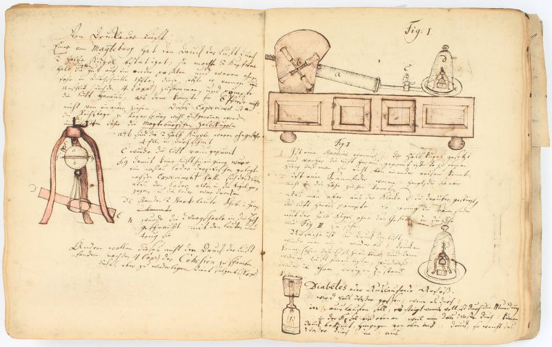 Small Collection of very rare original materials from the library german Mathematician and Inventor of Optical, Medical & Scientific Instruments, Dr. Gottfried Tauber. The collection includes: 1. A stunning, allegorical Painting of Gottfried Tauber by Daniel Caffe (pinxit 1808) which is beautifully framed, with a significant but repairable tear 2. Gottfried Tauber’s personal Manuscript-Notebook [which he obviously kept during his early studies at “Schola Altenburgensis”], titled: “Physic a Tauber – Penticoste’s Tempore – 1784” with Drawings and detailed scientific experiments, 3. An important, printed publication from Tauber’s Institute, titled: “Anweisung Anweisung für auswärtige Personen, wie dieselben aus dem Optisch-Oculistischen Institute zu Leipzig… mit Zuverlässigkeit solche Augengläser bekommen können”. The publication explains not only in detail Tauber’s ability to select the right eye glasses for different stages of loss of sight. The publication, printed in 1851, also advertises the optical and medical inventions of Tauber (Microscopes, Tattoo-Presses, Needles for Inoculation, Camera Lucida, Camera Obscura, Thermomoeters, Meteorological Instruments etc. etc.). Gottfried Tauber was the founder of the Optical – Oculistic Institute in Leipzig / Germany and became famous for the invention of Glasses and several scientific instruments in the fields of Optic and medicinal as well as meteorological instruments . The Manuscript Notebook in the collection includes Gottfried Tauber’s personal elaborations on significant scientific experiments, even mentioning Benjamin Franklin’s Kite-Experiment from 1752 (″Doct. Fränklin in Amerika gab 1752 die erste Nachricht im Dienst von Ableitern…”). Tauber’s many talents led to him being installed as teacher of mathematics already six years after starting his manuscript notebook in 1784. Many of the experiments Tauber noted down in his manuscript and embellished with drawings, would later lead to his own inventions of tools and instruments useful for medicince and science in the ever experimental 19th century.